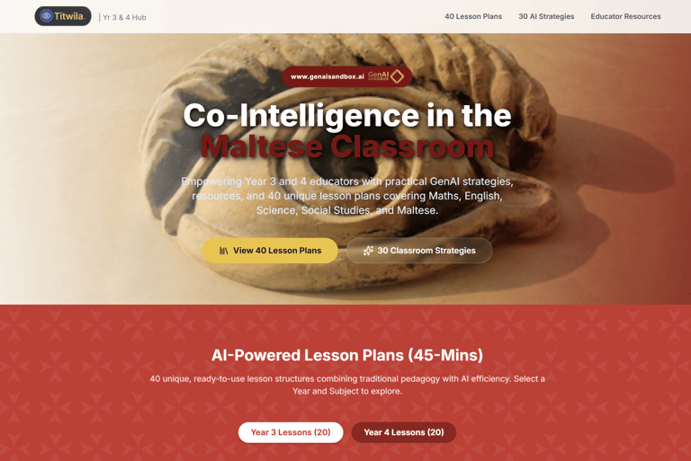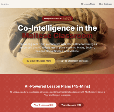 This webpage is a localised digital hub designed to empower Maltese Year 3 and 4 educators by practically integrating Generative AI into their daily teaching. It provides 40 ready-to-use, AI-powered lesson plans and a curated directory of educational tools to help reduce teacher workload and boost student engagement.