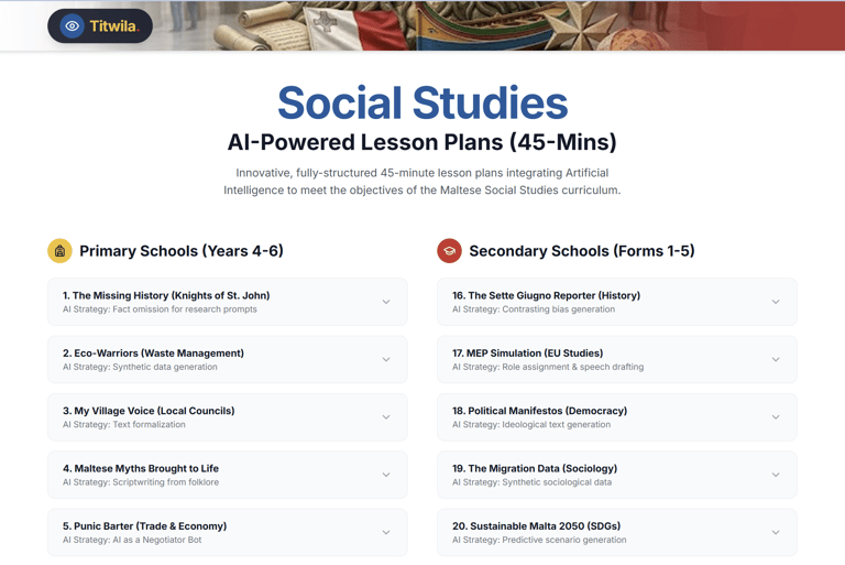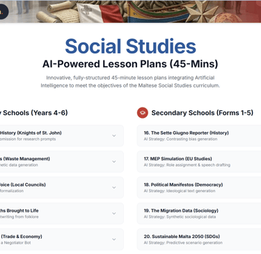 This webpage serves as an educator hub designed to help Maltese teachers integrate AI into their social studies lessons for primary and secondary students. It provides fully-structured, 45-minute AI-powered lesson plans, teaching strategies, and curated resources.